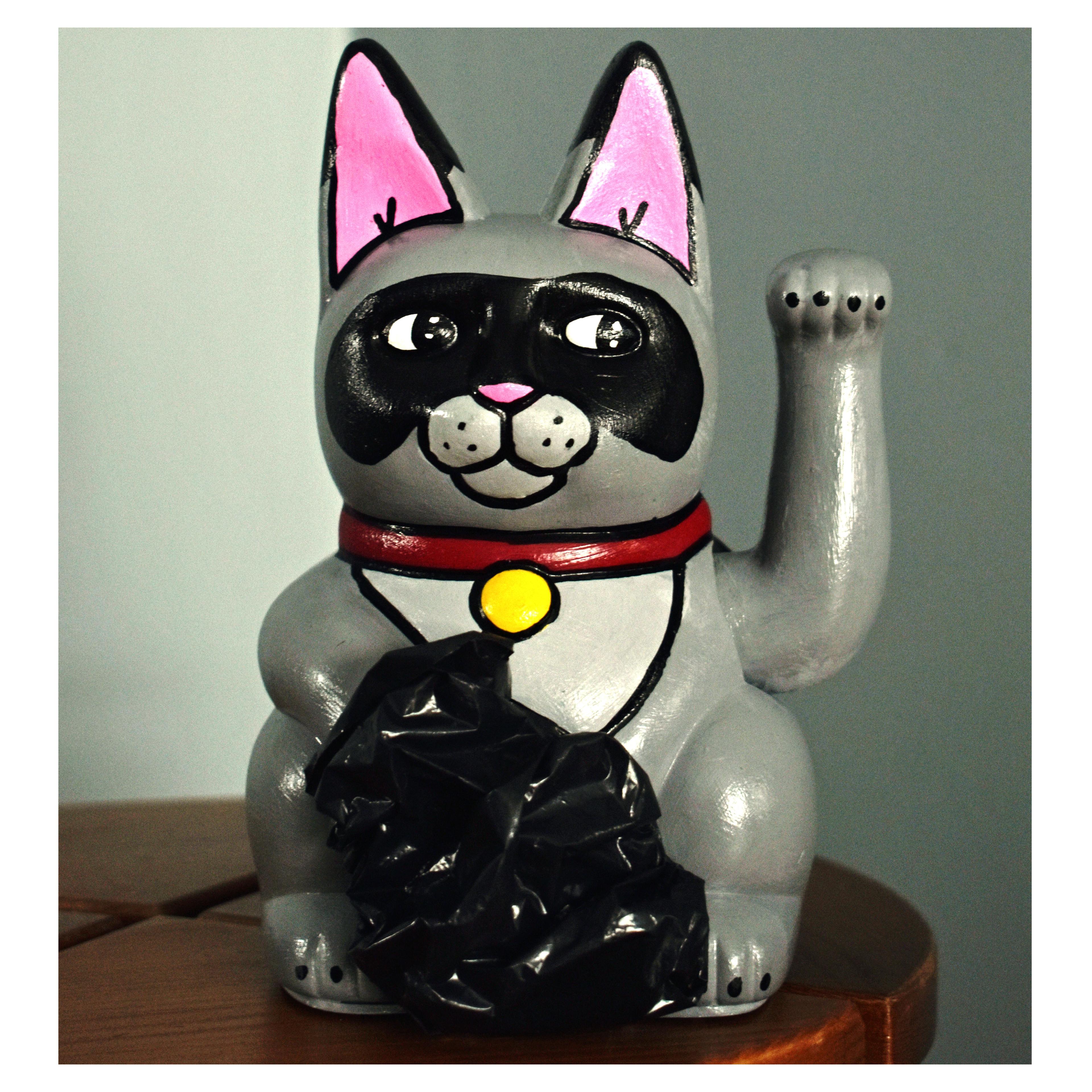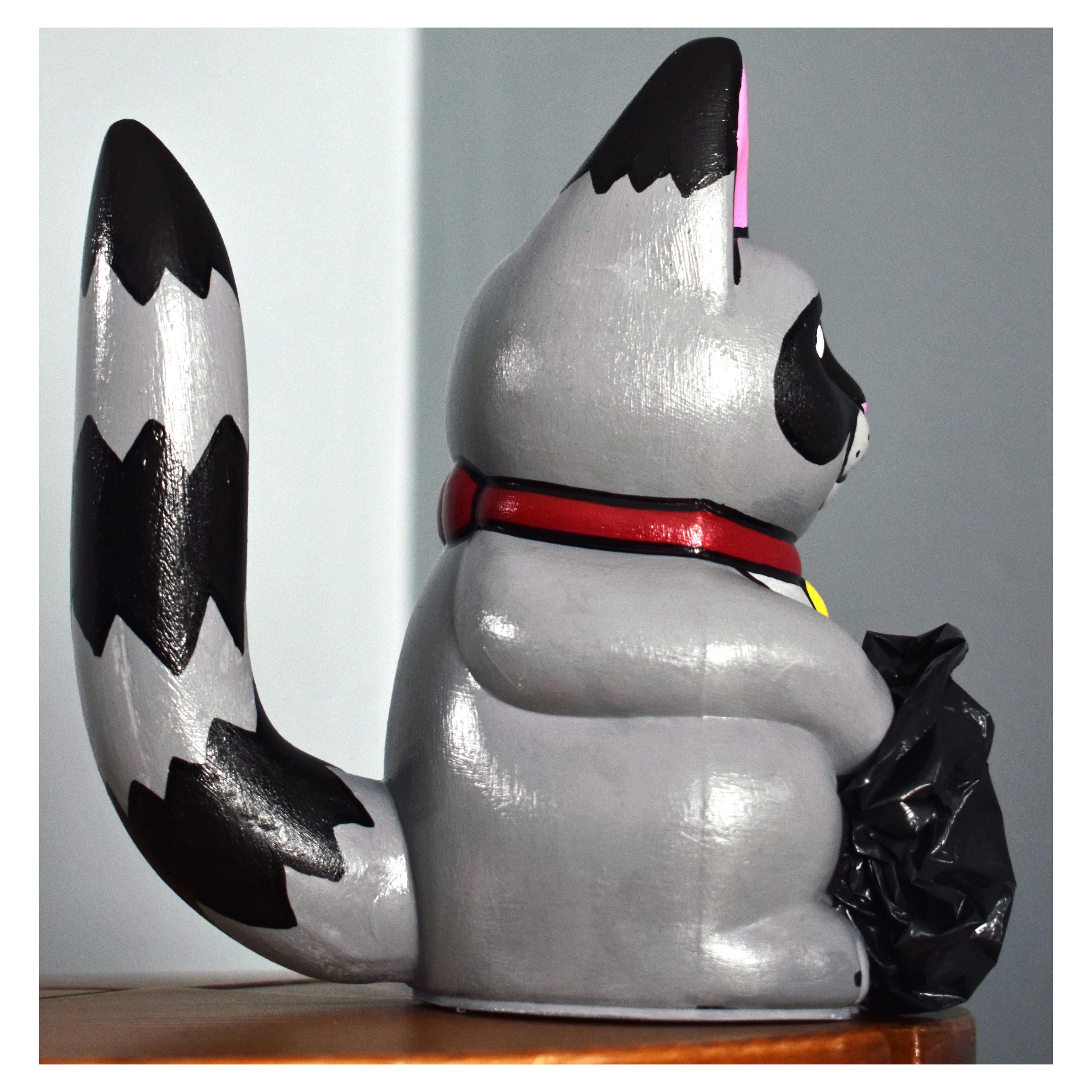 In 2019, Crowsnest Barbershop in Ottawa held a fundraiser where they asked artists to re-imagine some Lucky Cats. I took mine in a different direction and shaped it loosely into my iconic raccoon character. I sanded, primed and painted my ‘lucky cat’ grey with the raccoon eye mask and a red collar. I also designed a 3-D printed raccoon tail which I epoxied onto the back of the cat and then used an x-tra tuff garbage bag glued to the front to look like the raccoon was digging in the garbage. This design obviously fundraised some big bucks.
