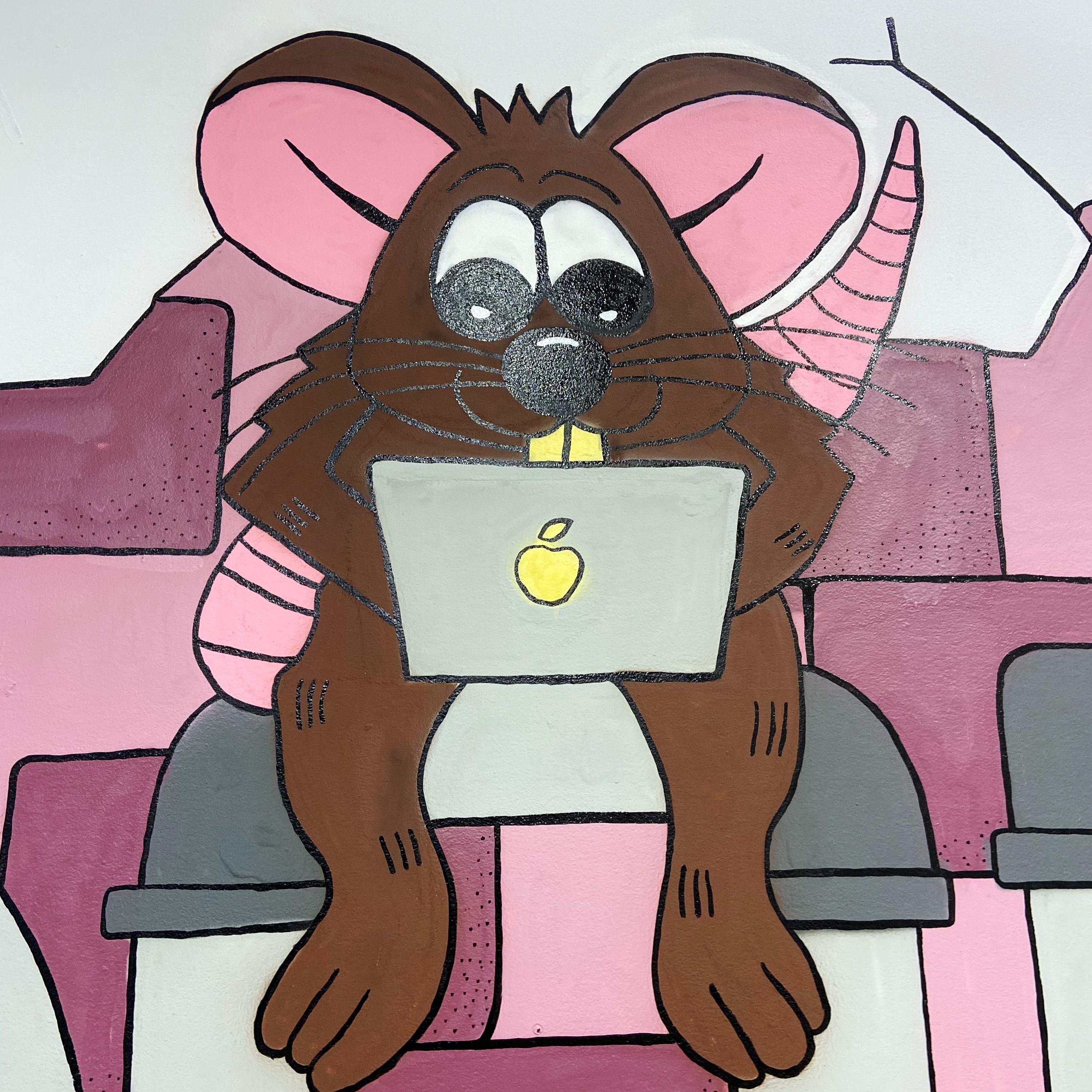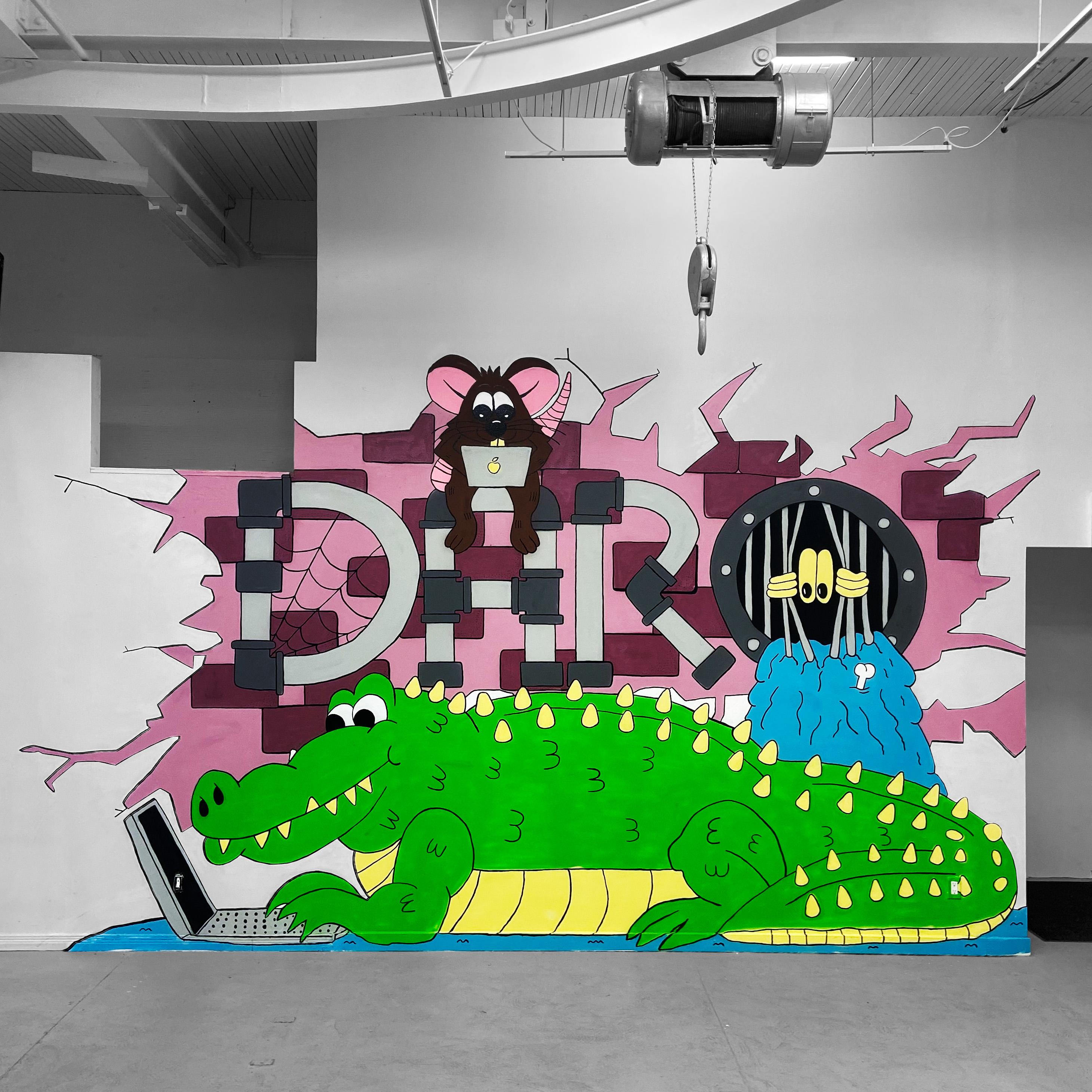 Probably my biggest mural to date at 18 feet tall. Painted for Daro in Little Burgundy, this project was really fun to work on. Daro is a data company named after the ancient city of Daro that had the first sewer system in existence. Daro wanted my personal style to be reflected in a mural that combined the sewer idea with tech/data, so naturally I needed both a rat and a gator (both well-known sewer dwellers) included in the design. The fill colour in the design is spray paint, and all of the outlines are done with 1 shot enamel paint and a brush.