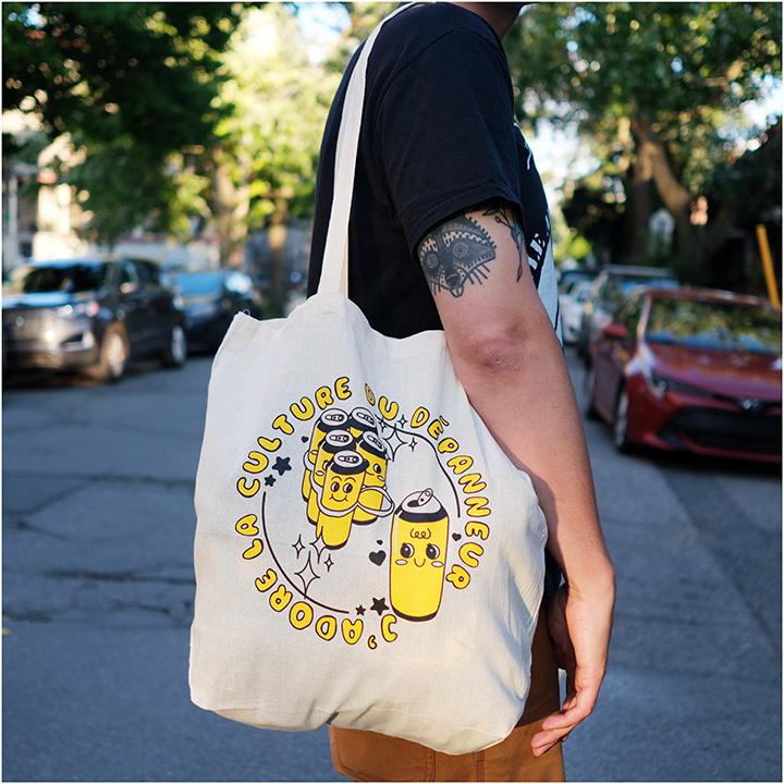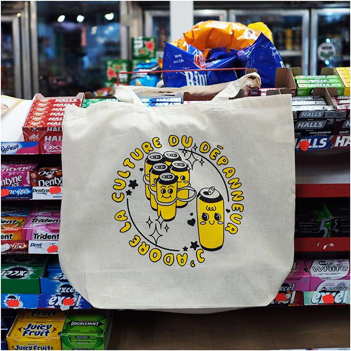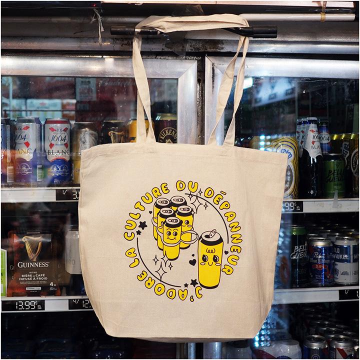 Another ode to the dépanneur. Imagined, designed, and printed in Montreal. I decided to print these totes on a little thinner of a bag than my other totes so that it can be folded up and put in your back pocket when you go buy a pack of darts, two 710s, 4 muffins and a pepperoni stick. I gifted one to the dep guy and he loves it.